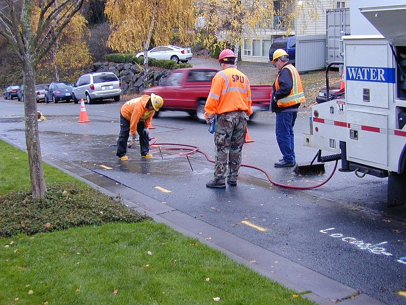 I came inside ta dry off... Not only is it gushing, but it's pouring as well! Hopefully it'll be repaired by bedtime... However this crew IS on overtime, and they all hafta work safely! I checked 'em out for PPE... They're compliant, not ta mention they DID have the job briefing before touching a damn thing! That's a biggie with Seattle Public Utilities now...