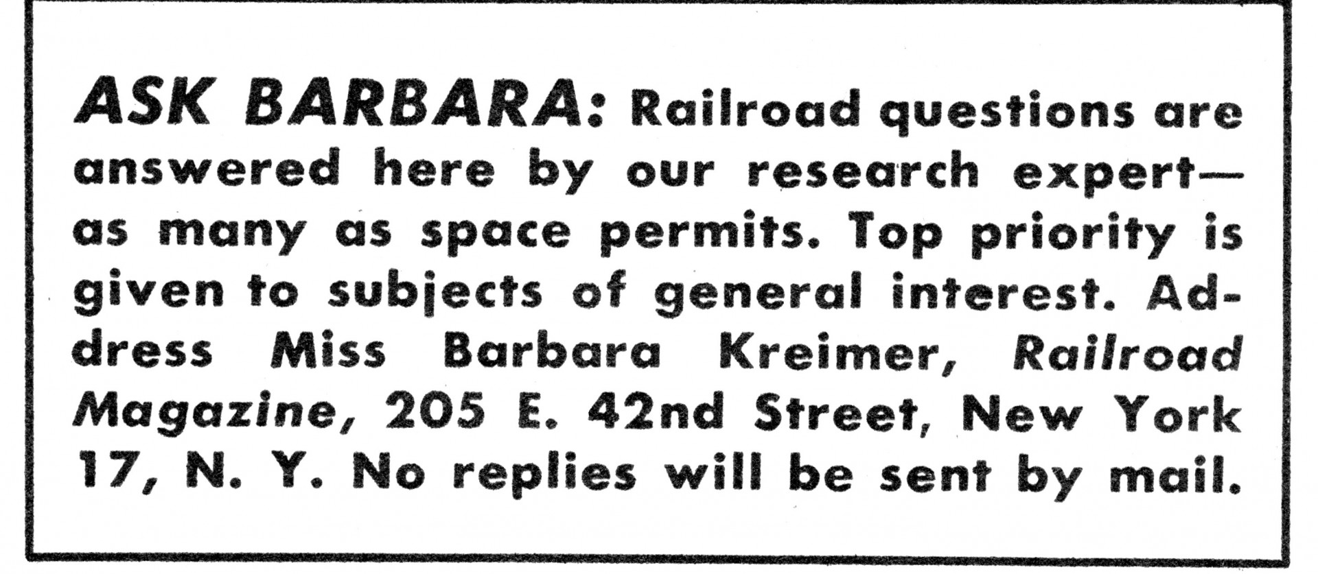 Gotta tell ya Krink, maybe you heard same thing tho...An interview with david engalls the diesel guy about why Railroad was sold and he said the old editor in chief of Railroad Magazine was pushing for too many pictures with young ladies with racy clothing, as well as the Ask Barbara section that was just someone in the office thinking up questions and answering them, the mail that came in from readers for ask Barbara was just gathered up and thrown away, in fact there was no Barbara at all they used a picture of a woman they found on the floor in the printing room.