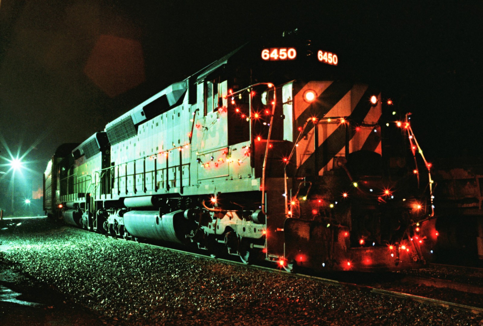 I just happened to be working 3rd trick Blaine Wa. Christmas Eve 1982 and a pair of SD-45's all decked out in Xmas lights comes into Blaine and of course has to stop for a while. Never saw this coming as the BN never ran any Xmas specials but this was the idea of the train crew with a lot of help from the Interbay Roundhouse to just get this to stay affixed to a fast moving freight train for 125 miles. Just seeing a pair of SD-45's in Blaine would have been enough of a Xmas gift..but with strings of Xmas lights. Great moments.