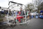 Zane Fischer, sits in his hamster ball bike before a Ben Hur-like chariot race at Chariot Wars during a three-day Mini Bike Winter Olympics Saturday, Feb.18, 2012, in Portland, Ore. Armed, variously, with all manner of foam-padded apparatus, at least five teams did battle on Saturday under gray skies for the pleasure of hoisting a three-foot-tall, homemade skull-bearing piece of welded junk, called the Ben Hurt trophy. (AP Photo - Rick Bowmer)