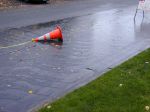 Gonna be lotsa phun! Rain pouring down... The right front wheel was parked right over that spot! Damn certain that whole area's been washed out by the leak... Musta broken last night, or very early this morn... I went for a haircut about 1100, and that's when I notice the 'spout' squirtin' under my PUP!