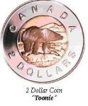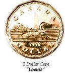 What Thunderman is on about... The one dollar Canadian/Canadien dollar, called the looney, or loonie because of the image of a loon (the bird) on the coin... And the two dollar coin, called a toonie (?) or twooney, or twoonie... Whatever! They're close to our dollar in value...